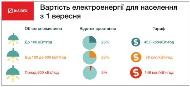 С 1 сентября при потреблении электроэнергии в объеме до 100 кВт/час. тариф вырастет на 25% и составит 45,4 коп. за кВт-час. При потреблении от 100 до 600 кВт/ч в месяц тариф увеличится на 25% и составит 78 коп. за кВт-час. А при потреблении более 600 кВт/ч. электроэнергия подорожает на 5% – 1,48 грн/кВт-ч.