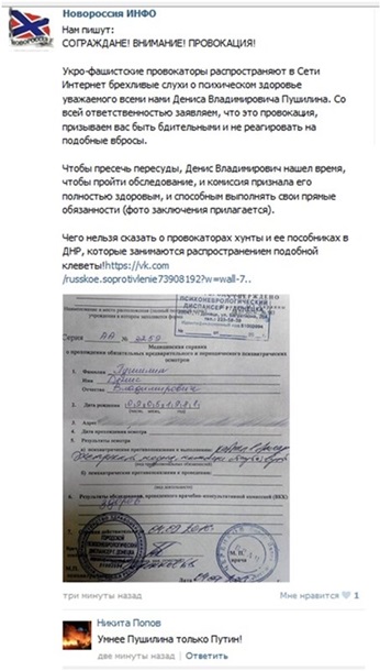 В социальных сетях среди групп, симпатизирующим сепаратистам, появилось опровержение информации о том, что председатель «Народного совета» ДНР Денис Пушилин имеет психические отклонения.