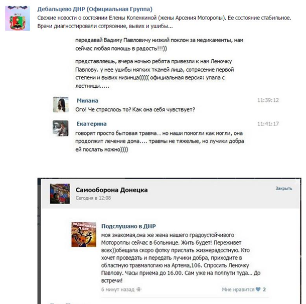 В сепаратистських ЗМІ з’явилися скріншоти переписки мед. персоналу Донецької обласної травматологічної лікарні, в яких одна з мед. сестер розповідає, що у жінки діагностовано забиття м’яких тканин, струс мозку та вивих мізинця. А лікарям наказано дотримуватись «офіційної версії» - побутова травма.