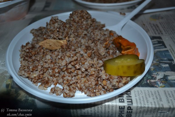 Після імпровізованого концерту й роздачі автографів нас пригощають сніданком. Цього разу гречка святково урізноманітнена солоним огірком. З цього робимо висновки, що з овочами у зенітників швах. Тож консервація, соління, маринади не будуть лишніми в нехитрому солдатському раціоні. Давайте но читачі піднапружимося і зберемо смакоти для вояків.
