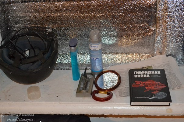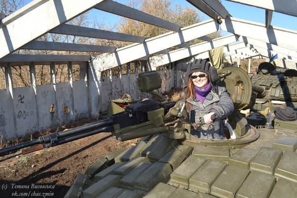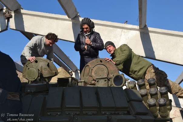 Водій-механік має трохи більші апартаменти, але й тут тісно… Ех, важка доля танкістів. Але хлопці сміються: «Хіба ми воюємо? Ми так, виїдемо – трохи стрельнемо і назад!» Жартівники! Нашому водію Анатолію командир дозволяє завести двигун танка. Потужний гуркіт рве барабанні перетинки, але Толя щасливий. Тут же стоять кілька хлопців, один із них воював в Донецькому аеропорту разом із білоцерківцями. Набираємо одного з них і з’єднуємо бойових побратимів. Такі короткі телефонні зустрічі.