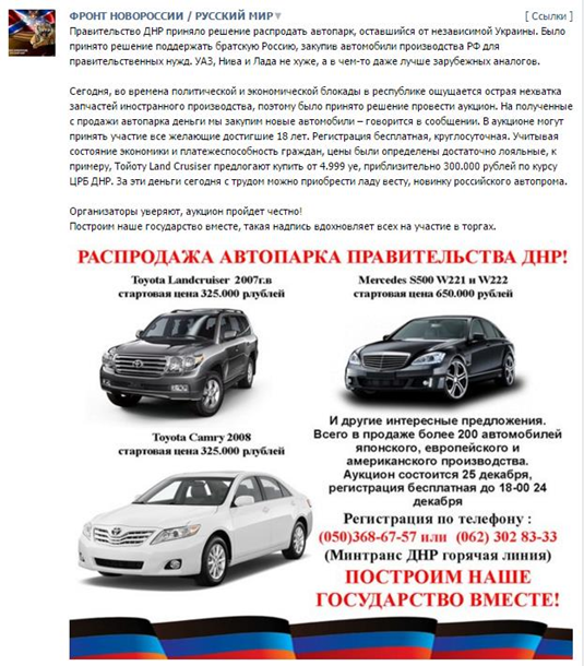 Сепаратисты ДНР объявили о распродаже правительственного автопарка