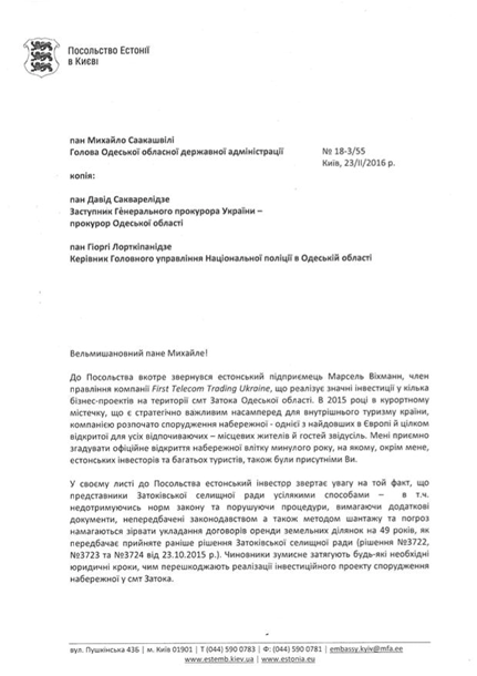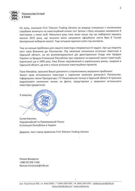 полномочный посол Эстонской Республики в Украине Сулев Канникэ направил письмо