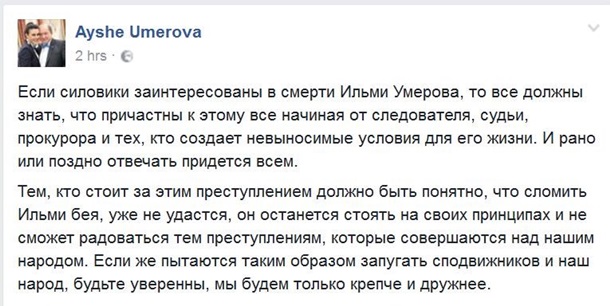 Первым, кто примерял на себя тавро политзаключённого, стал зампред Меджлиса крымскотатарского народа Ильми Умеров, против которого сфабриковано дело о сепаратизме. После ряда нарушений в деле Умерова со стороны судьи подконтрольного России Киевского райсуда Симферополя Татьяны Рубе, она отправила неугодного российской власти на принудительную психиатрическую экспертизу. Спустя некоторое время дочь Умерова написала на своей странице в Фейсбуке о том, что здоровье ее отца резко ухудшилось, и во время ее посещения он потерял сознание. Страшно представить, как "заботятся" о "больных" в этой психиатрической больнице.