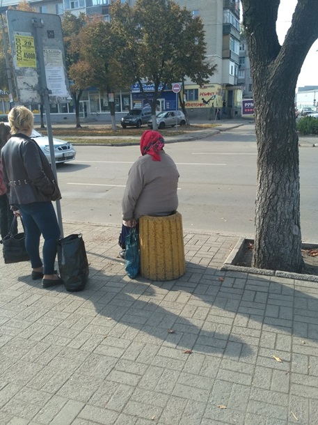 А вот еще одна мелочь из этой же сферы жизни города. И эту мелочь уже не спишешь на частных перевозчиков. Отсутствие хотя бы минимально обустроенных остановок транспорта целиком лежит на совести городской власти. Женщина вынуждена сесть на урну, поскольку на остановке не оказалось лавочки. Я уж не говорю о козырьке от дождя. И это самый центр города! Рядом центральное отделение Ощадбанка, супермаркет АТБ, еще масса заведений, а остановка транспорта существует лишь как металлический столб с табличкой.
