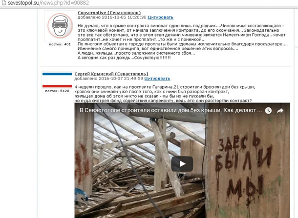 В понедельник, 10 октября, как раз за неделю до старта отопительного сезона в Севастополе, и.о. директора Департамента городского хозяйства Андрей Чибисов бодро . Если в скором времени найдут подрядчиков и выделят им необходимое количество средств, то починить крыши можно будет только в ноябре. В этом заявлении интересны 2 момента: во-первых, ситуация возникла потому, что город не заплатил подрядчикам, а это значит, что и следующие подрядчики рискуют остаться без денег, ну и во-вторых, история развивается осенью, в сезон дождей, что свидетельствует о демонстративно наплевательском отношении отцов города к его жителям.