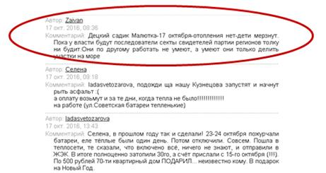 На возмущение граждан власти ответили разъяснением, что старт отопления означает первоочередное подключение объектов социальной инфраструктуры, т.е. детских садов, школ, больниц и т.п., а уже потом, через пару дней, тепло подается в дома. Однако, комментарии за 20 октября не оставляют властям шансов для оправданий: