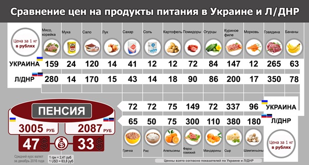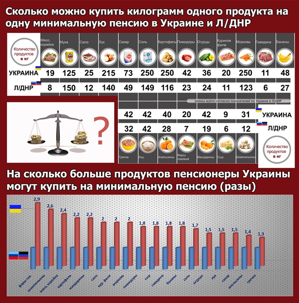 Первая необходимость для каждого человека это пища. Ниже показаны цены на продукты питания, количество купленных килограмм продуктов на одну минимальную пенсию в Украине и "Л/ДНР". После сравнения можно сделать вывод, что уровень жизни на оккупированных территориях значительно ниже, чем в Украине.