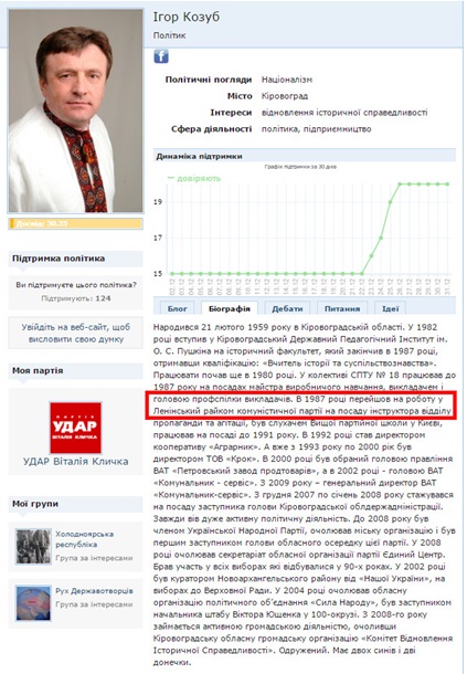 Порушувати демократичні принципи і відверто збурювати громадськість Ігору Козубу не вперше - одіозний "активіст на пенсії" "засвітився" в багатьох скандалах. Він почав свою "кар'єру" у Ленінському райкомі комуністичної партії на посаді інструктора відділу пропаганди та агітації, пізніше був слухачем Вищої комуністичної партшколи у Києві, працюючи на цій посаді до 1991 року. Завжди вів дуже активну політичну діяльність. За 90-ті та 2000-ні Козуб змінив 6 політсил. Зокрема, зі скандалом був виключений з партії "Удар" після того, як стало відомо про розкрадання партійних коштів, до чого він, ймовірно, мав прямий стосунок.