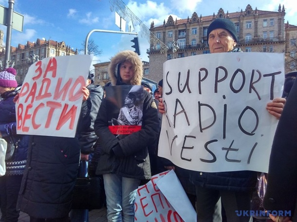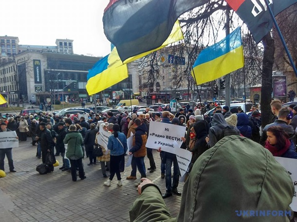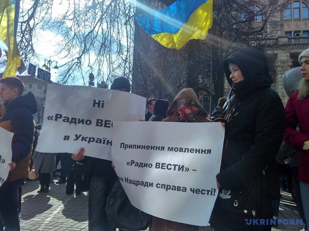 Сначала под Нацсовет пришло около 60 человек, которые держали в руках плакаты с надписями: «Нет» Радио Вести «в Украине!», «Долой кремлевский рупор -» Радио Вести «Прекращение вещания «Радио Вести» — для Нацсовета дело чести! «.