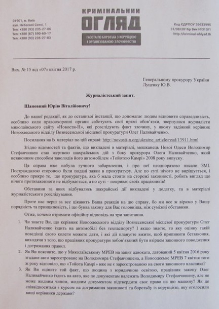 журналістський запит на ім`я генерального прокурора України Юрія Луценка.
