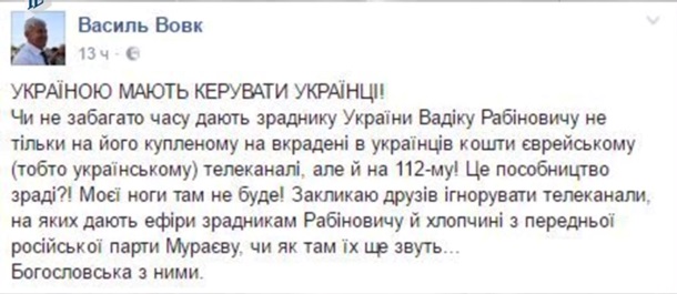 И свои слова Вовк высказал не в пьяном угаре друзьям-пенсионерам в сауне, а разместил на странице в сети Фейсбук. Правда, боевой пыл Вовка несколько поутих, когда в СМИ разгорелся нешуточный скандал по этому поводу. Пост был немедленно удален, но скрины-то, как говорится, не горят, и переписка с оппонентами попала в СМИ. Ее предоставил политик Константин Бедовой.
