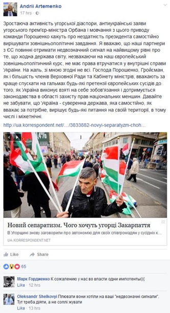 Более того, как видно из вышеизложенного, Киев даже не думает идти на уступки, наоборот, агрессия со стороны украинских властей в адрес венгров только усиливается. Например, депутат Верховной Рады Артеменко обратился к своим европейским коллегам с вот таким посланием: