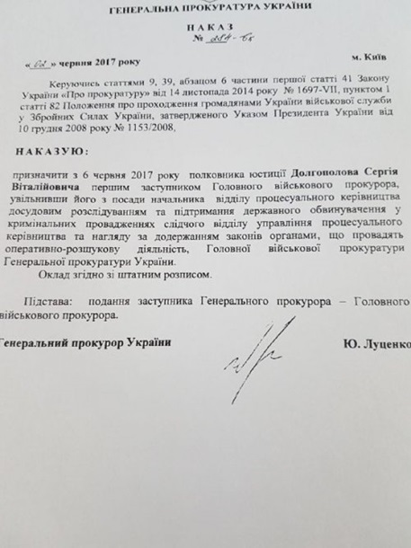 и информации ГПУ. А с подачи Матиоса 6 июня 2017 года генпрокурор Юрий Луценко назначил Долгополова