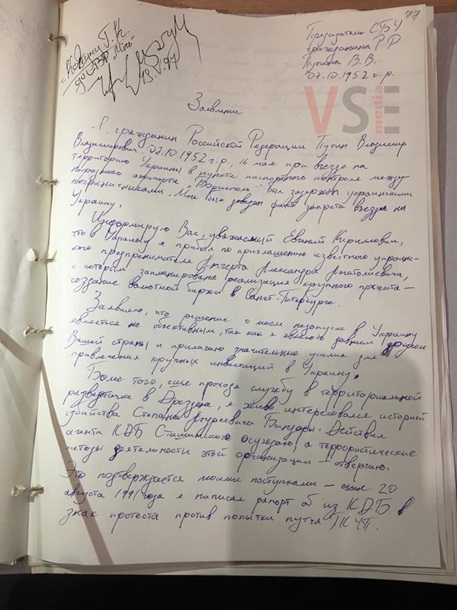Я, гражданин Российской Федерации Путин Владимир Владимирович, 07.10.1952 г.р., 16 мая при въезде на территорию Украины в пункте паспортного контроля международного аэропорта «Борисполь» был задержан украинскими пограничниками. Мне был доведен факт запрета въезда на Украину.
