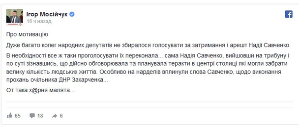 По мнению нардепа от Радикальной партии Игоря Мосийчука Савченко сама убедила парламентариев проголосовать за ее