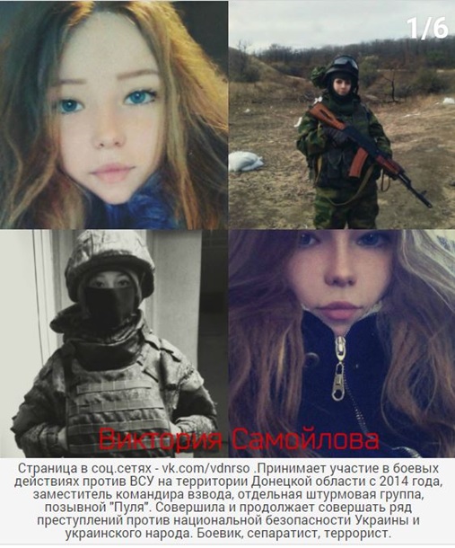 Девушки представленные ниже на фото, принимают (принимали) участие в боевых действиях на территории Донецкой области против ВСУ с 2014 года. Эти девушки преступны и опасны для мирного населения, они совершили и продолжают совершать ряд преступлений против национальной безопасности Украины и украинского народа. Все эти представительницы слабого пола должны понести наказание в полном объёме.