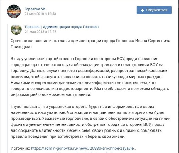 населения Горловки появилась в сети неделю назад. Так, по словам и.о. мэра –