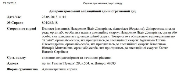 Справу розглядає вже Дніпропетровський апеляційний адмінсуд. Бо Дніпропетровський окружний адмінсуд відмовився визнавати рішення міської ради таким, що суперечить законодавству України.