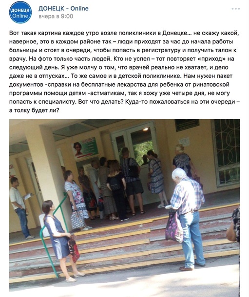 свидетельствам дончан, каждое утро в поликлиниках Донецка собираются большие