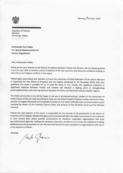 Глава польського МЗС Яцек Чапутовіч за допомогою спецпредставника Держдепартаменту США з питань України Курта Волкера домовився про проведення "Маршу орлят перемишльських і львівських" у Львові.