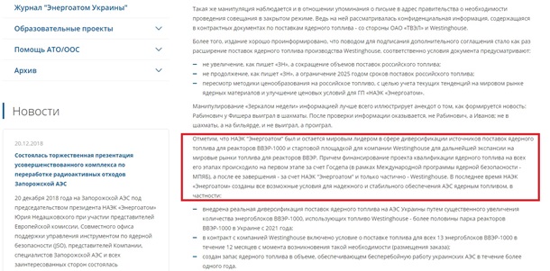 В пылу опровержений "Энергоатом" сделал заявление, тянущее на полноценную госизмену. На официальном сайте госкомпании сообщается, что она была и остается "...стартовой площадкой для компании Westinghouse для дальнейшей экспансии на мировые рынки топлива для реакторов ВВЭР. Причем финансирование проекта квалификации ядерного топлива на всех его этапах происходило на первом этапе за счет Госдепа".