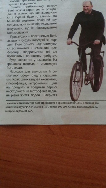 Однако самое интересное было припрятано под конец. Как оказалось, заказчик этой байды - кандидат в президенты Сергей Каплин. Тираж - 100 тысяч (!) экземпляров. Там же публикуется и заявление Каплина в духе "ходить привид по Вкраїні, привид зеленізму". Господин Каплин патетически предостерегает Украины от прихода к власти господина Зеленского и предрекает тотальную катастрофу, если так всё же случится.