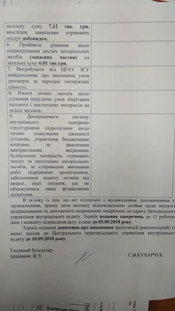 Одной из первых, кто отреагировал на наше расследование касательно коррупции полковника Иванива, была главный бухгалтер в/ч А1358 Светлана Владимировна Кухарчук, ставшая на защиту командира части. Именно ее фамилия стоит под результатами внутреннего аудита 47-го арсенала хранения боеприпасов в сентябре 2018 года.