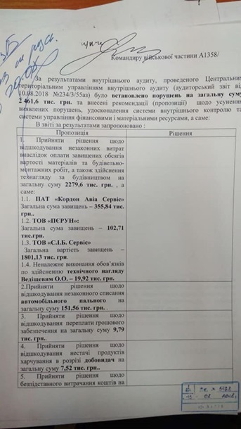 Согласно внутреннему аудиту в/ч А1358, одно из крупнейших нарушений в размере 355,84 тыс. грн. пришлось на ЧАО «Кордон Авіа Сервіс». И именно эта фирма «засветилась» в расследовании СБУ.