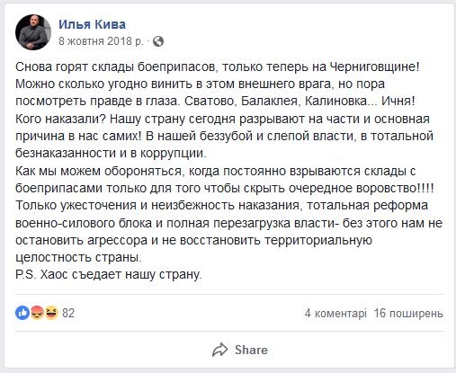 Кстати, когда взрывались боеприпасы в Ичне, глава Социалистической партии Украины Илья Кива прямо заявил, что взрывы складов – это попытка скрыть очередное воровство.