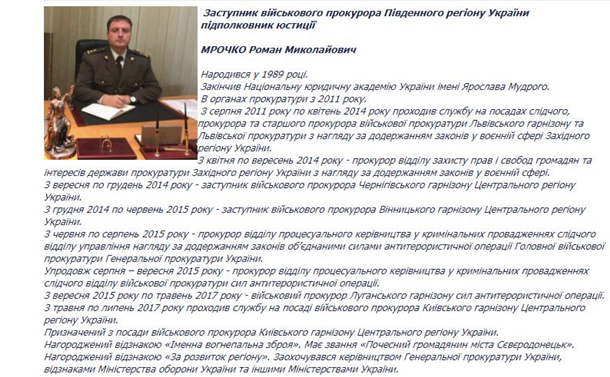 “Господин Мрочко, с 2015 года служит военным прокурором и проживает в Рубежном. Есть информация, что скоро он переводится в другой город. Из северодончан его никто не знает и его заслуг”.