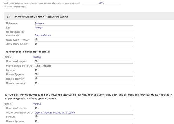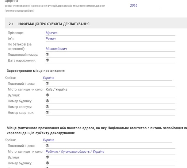 Однако история с наградным оружием, которое не указано в декларации, – это, так сказать, вершина айсберга. В 2017-ом году военный прокурор Луганского гарнизона Романа Мрочка ждала следующая приятная «неожиданность»: он стал почетным гражданином города Северодонецка! При этом Роман Мрочко НИКОГДА не проживал в г. Северодонецке! Во время присвоения почетного звания военный прокурор Луганского гарнизона преспокойно проживал в другом городе – г.Рубежное, о чем и указывает в декларации за 2016г., а после назначения его на должность заместителя военного прокурора Южного региона Украины – в г. Одесса: