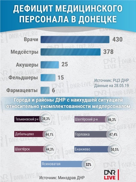 По данным республиканского центра занятости ДНР – по состоянию на 31 мая открыто более 800 вакансий для врачей и медсестер. А это уже очень немалый показатель. Вот только в большинстве случаев нормальные специалисты стараются покинуть территорию республики. На одном альтруизме все же тяжело работать. Учитывая низкую заработную плату, которую и без того задерживают – понятное дело никому не хочется оставаться в ДНР. При чем выполнять свои обязанности приходится в условиях старого и нерабочего оборудования, а также с острой нехваткой медикаментов. Если принять это во внимание – становится понятно, что у нас нету даже нормальных медицинских учреждений. Если бы власти хоть немного вкладывались в сферу здравоохранения и предлагали толковые условия – то и персонал потянулся бы.
