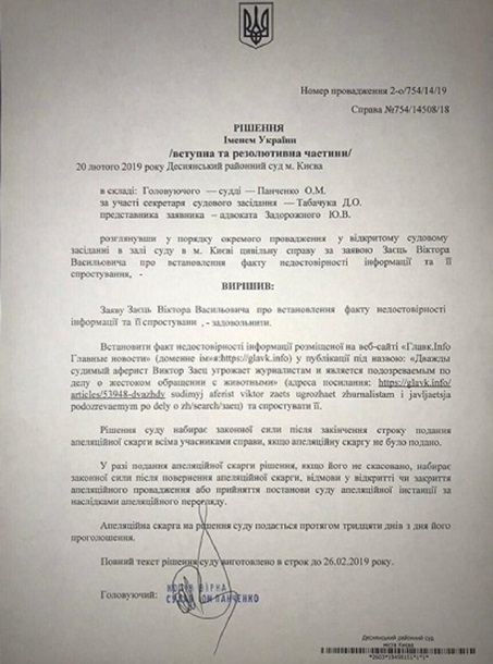 заявление Виктора Зайца о признании факта размещения ложной информации о нем.