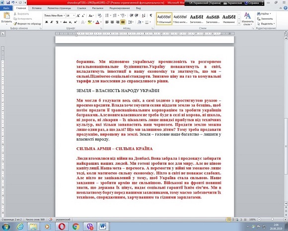 виглядає воно так: «Землю – головне наше багатство – лишити у власності народу».