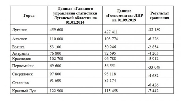 В той же время, уже сейчас российскими кураторами выдумана и реализуется очередная комбинация для организации фальсификации будущих выборов на Донбассе и давления на западное международное сообщество.Итак, по порядку. Понимая, что на выборах Президента Украины побеждает кандидат, который готов искать пути окончания войны на Донбассе, российские кураторы опять вернулись к наработкам по проведению местных выборов на Донбассе. Так, в апреле властями ЛДНР принимаются законы об обязательной переписи населения. Очевидно, что перепись населения в условиях войны, разрушенной экономики и нищего населения, для ЛДНР является финансово неподъемным мероприятием. Однако, российские кураторы Донбасса, не смотря на ограниченное финансирование, в срочном порядке выделяют необходимые суммы. Для ДНР – 310 млн. рублей, для ЛНР – 146 млн. рублей, фактически дополнительно 0,5 млрд. российских рублей идут на сомнительные «геополитические игры» Президента РФ. При этом, деньги в очередной раз, изъяты из российского бюджета у обычных россиян.Анализ количества выехавших из оккупированных районов Луганской и Донецкой областей в РФ и Украину, статистики смертей, а также проведенные социологические исследования в ЛДНР показывают значительное снижение количества оставшегося населения. Скрыть ужасную демографическую обстановку даже для представителей российских оккупационных властей с каждым годом становится все трудней. Однако, как и ранее в 2014 году статистические службы из года в год публикуют довоенные данные.Как пример, на сайте «Госкомстата» на 1 сентября 2019 года в ЛНР постоянно проживает 1 миллион 443 тысячи человек. Городское население составляет 1 миллион 353 тысячи человек, а сельское – 89 тысяч. Это чрезвычайно оптимистичные цифры и к реальности отношения не имеют.Доказательства можно найти на сайте «Главного управления статистики Луганской области» , где приведена таблица численности населения на 01.01.2014, т.е. до войны на Донбассе.