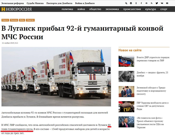 На территорию так называемых Л/ДНР прибыл 92-ой гуманитарный конвой от Российской Федерации в составе 23 автомобилей. На официальном сайте МЧС РФ написано, что автомобили доставили свыше 370 тонн