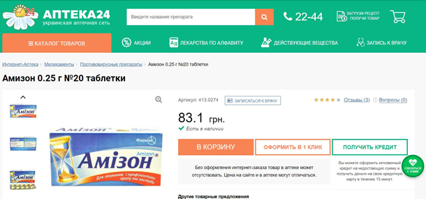 возьмём типичные таблетки от простуды “Амизон” 0,25 г. №20.