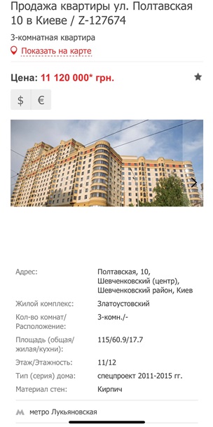 Стоимость аналогичной квартиры в центре Киева по адресу Полтавская, 10