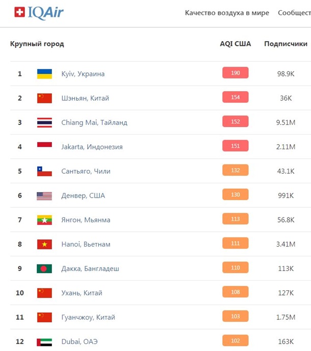 Украины обычно нет в числе стран с самым грязным воздухом. Бангладеш, Пакистан, Индия, Индонезия, Китай. В этом же списке не особо промышленно развитые, но очень засушливые Монголия, Афганистан, Узбекистан, Ирак. Из европейских городов в списке постоянно итальянские, польские, балканские населенные пункты. Но не столицы, а именно промышленные города.