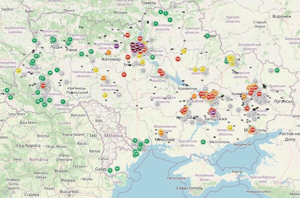 В целом за последние сутки стало лучше, чем было в предыдущие, но показания отдельных станций продолжают зашкаливать. На запад от Киева AQI по прежнему 400+.