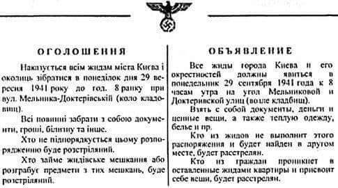 79 років тому, саме з цього оголошення, почалася трагедія Бабиного Яру. За перші дві доби гітлерівці вбили 33 771 людину
