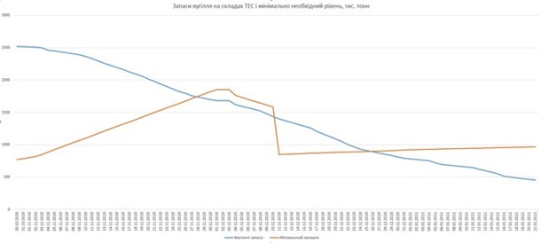 Так, 10 грудня вимога до мінімальних запасів складала 1,58 млн тон, а вже 11 грудня була знижена до 0,85 млн тон. Це дозволило ТЕС, не порушуючи ліцензійні умови, спалювати вугілля понад прогнози. Більше вугілля спалювали через збільшення частки теплової генерації, що було пов’язано з ремонтом атомних блоків та забороною імпорту електроенергії. З різким похолоданням ТЕС достатньої кількості вугілля не підвезли.