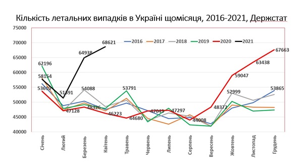 ТОЛЬКО в апреле в Украине умерло на 21 тысячу человек больше, чем в среднем за 5 предыдущих лет - 68600 против 47400. 11 тысяч - смерти, связанные с Covid. А еще 10 тысяч - это что? Недиагностированный Covid? Нелеченные инфаркты? Люди, которые ПРОСТО умерли?