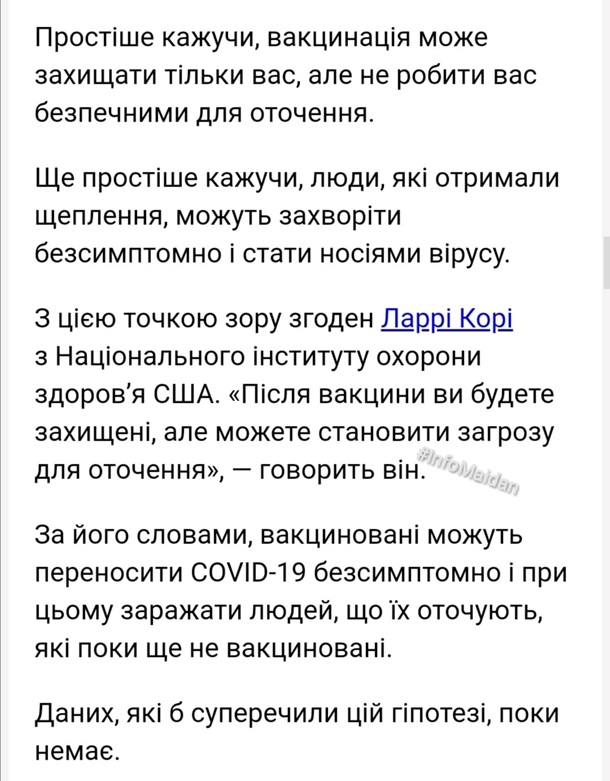 Більше того, вакциновані люди при зараженні переносять хворобу переважно в легкому стані та навіть безсимптомно, тобто в цей момент є носіями та розповсюджувачами хвороби, але навіть не знають про це, не ізолюються і вільно знаходяться серед інших людей, розповсюджуючи небезпеку.