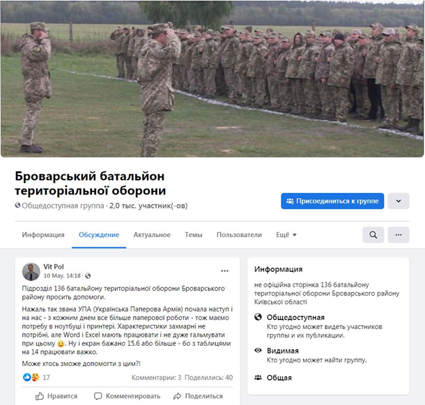 мысль наводит сообщение от 10 мая в ФБ-группе «Броварський батальйон