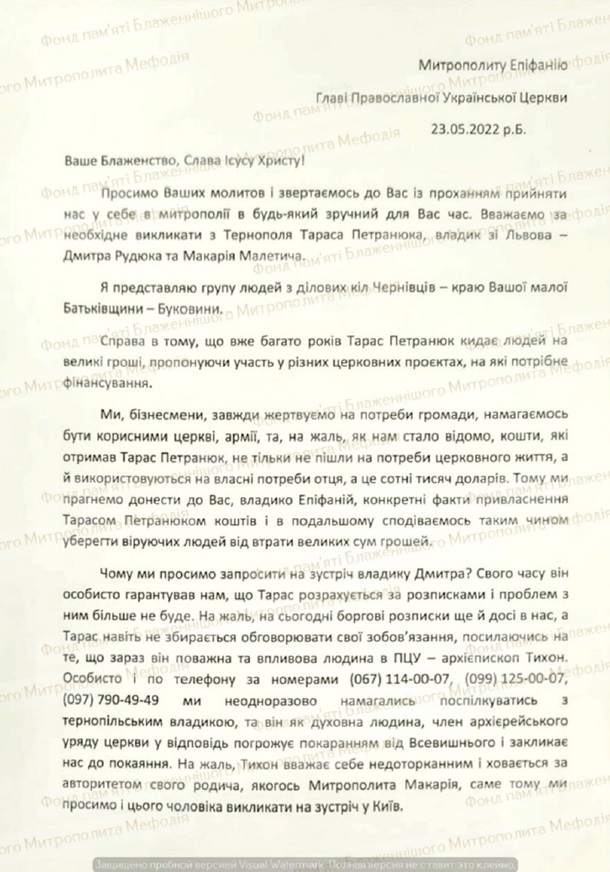 Тараса Петранюка, що були подані на розгляд Предстоятелю. Архієпископ Тихон є