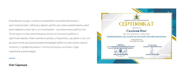 вдосконалив свої навички, пройшов онлайн курси «Криптобізнес: від основ до