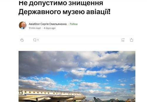 Директор Державного музею авіації ім. О.К. Антонова Сергій Омельяненко на своїй сторінці у ФБ оприлюднив заяву про тиск і спробу рейдерського захоплення ДМА.