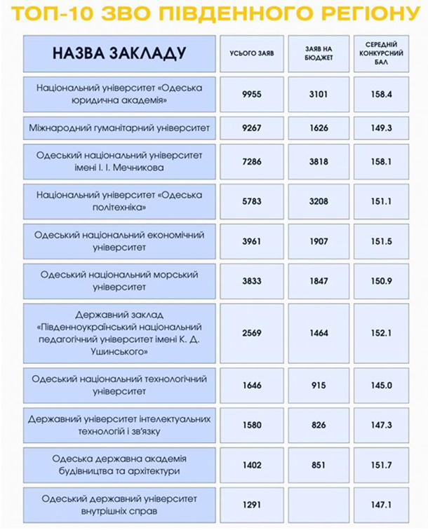 цифр, то до Одеської юракадемії надійшло 9955 заяв, а до ОНУ ім. Мечникова –